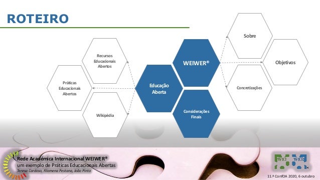 2. 2. Rede Académica Internacional WEIWER® um exemplo de Práticas Educacionais Abertas Teresa Cardoso, Filomena Pestana, João Pinto ROTEIRO Educação Aberta WEIWER® Considerações Finais Recursos Educacionais Abertos Práticas Educacionais Abertos Objetivos Sobre Concretizações Wikipédia 11.ª ConfOA 2020, 6 outubro