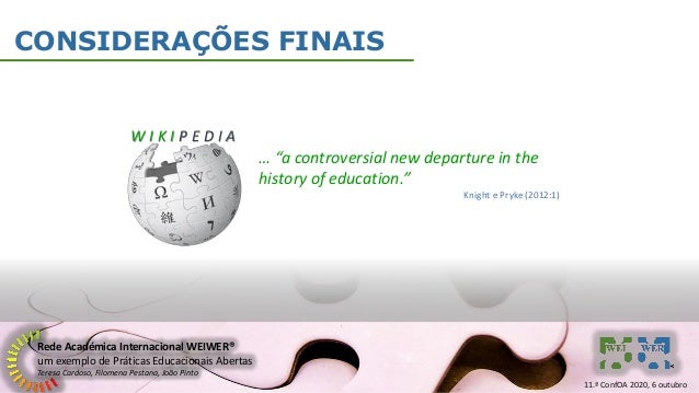 20. 20. Rede Académica Internacional WEIWER® um exemplo de Práticas Educacionais Abertas Teresa Cardoso, Filomena Pestana, João Pinto CONSIDERAÇÕES FINAIS … “a controversial new departure in the history of education.” Knight e Pryke (2012:1) W I K I P E D I A 11.ª ConfOA 2020, 6 outubro