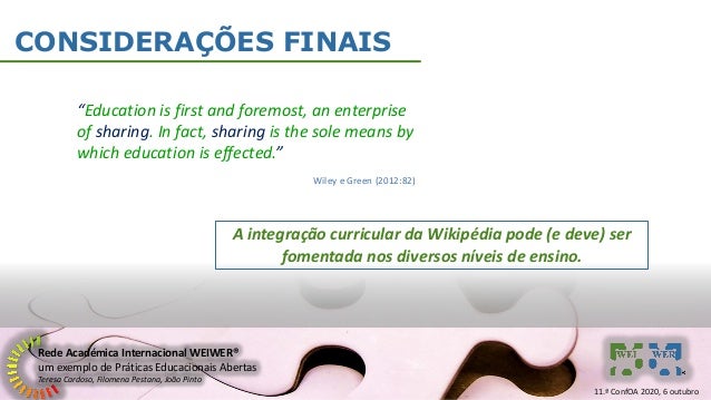 21. 21. Rede Académica Internacional WEIWER® um exemplo de Práticas Educacionais Abertas Teresa Cardoso, Filomena Pestana, João Pinto CONSIDERAÇÕES FINAIS “Education is first and foremost, an enterprise of sharing. In fact, sharing is the sole means by which education is effected.” Wiley e Green (2012:82) A integração curricular da Wikipédia pode (e deve) ser fomentada nos diversos níveis de ensino. 11.ª ConfOA 2020, 6 outubro