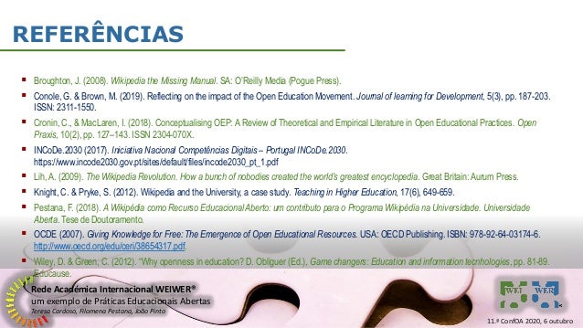 22. 22. Rede Académica Internacional WEIWER® um exemplo de Práticas Educacionais Abertas Teresa Cardoso, Filomena Pestana, João Pinto REFERÊNCIAS ▪ Broughton, J. (2008). Wikipedia the Missing Manual. SA: O’Reilly Media (Pogue Press). ▪ Conole, G. & Brown, M. (2019). Reflecting on the impact of the Open Education Movement. Journal of learning for Development, 5(3), pp. 187-203. ISSN: 2311-1550. ▪ Cronin, C., & MacLaren, I. (2018). Conceptualising OEP: A Review of Theoretical and Empirical Literature in Open Educational Practices. Open Praxis, 10(2), pp. 127–143. ISSN 2304-070X. ▪ INCoDe.2030 (2017). Iniciativa Nacional Competências Digitais – Portugal INCoDe.2030. https://www.incode2030.gov.pt/sites/default/files/incode2030_pt_1.pdf ▪ Lih, A. (2009). The Wikipedia Revolution. How a bunch of nobodies created the world’s greatest encyclopedia. Great Britain: Aurum Press. ▪ Knight, C. & Pryke, S. (2012). Wikipedia and the University, a case study. Teaching in Higher Education, 17(6), 649-659. ▪ Pestana, F. (2018). A Wikipédia como Recurso EducacionalAberto: um contributo para o Programa Wikipédia na Universidade. Universidade Aberta. Tese de Doutoramento. ▪ OCDE (2007). Giving Knowledge for Free: The Emergence of Open Educational Resources. USA: OECD Publishing. ISBN: 978-92-64-03174-6. http://www.oecd.org/edu/ceri/38654317.pdf. ▪ Wiley, D. & Green, C. (2012). “Why openness in education? D. Obliguer (Ed.), Game changers: Education and information tecnhologies, pp. 81-89. Educause. 11.ª ConfOA 2020, 6 outubro