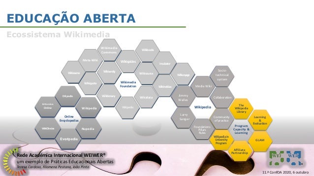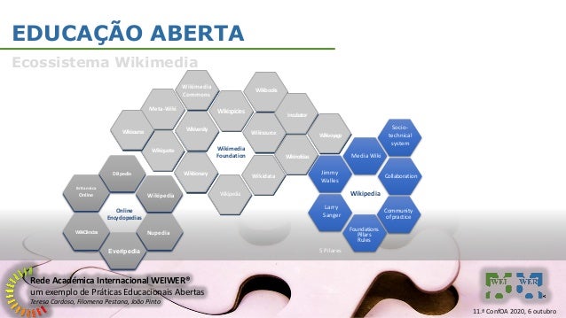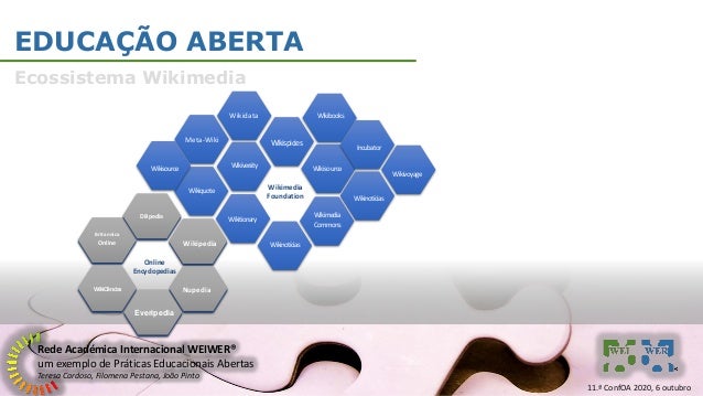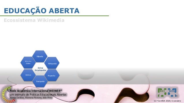 6. 6. Rede Académica Internacional WEIWER® um exemplo de Práticas Educacionais Abertas Teresa Cardoso, Filomena Pestana, João Pinto EDUCAÇÃO ABERTA Ecossistema Wikimedia Britannica Online DBpedia WikiCiências Online Encyclopedias Nupedia Everipedia Wikipedia 11.ª ConfOA 2020, 6 outubro