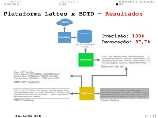11. 11. Contexto Metodologia Resultados e Conclus�es Plataforma Lattes x BDTD - Resultados Precis�o: 100% Revoca��o: 87,7% (11a. ConfOA 2020) 11 / 13