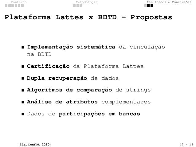 12. 12. Contexto Metodologia Resultados e Conclus�es Plataforma Lattes x BDTD - Propostas Implementa��o sistem�tica da vincula��o na BDTD Certifica��o da Plataforma Lattes Dupla recupera��o de dados Algoritmos de compara��o de strings An�lise de atributos complementares Dados de participa��es em bancas (11a. ConfOA 2020) 12 / 13