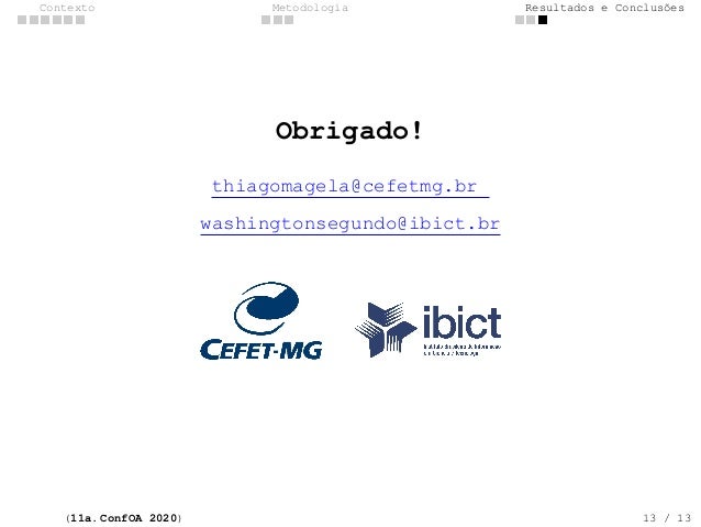 13. 13. Contexto Metodologia Resultados e Conclus�es Obrigado! thiagomagela@cefetmg.br washingtonsegundo@ibict.br (11a. ConfOA 2020) 13 / 13
