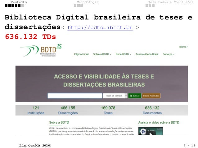 2. 2. Contexto Metodologia Resultados e Conclus�es Biblioteca Digital brasileira de teses e disserta��es< http://bdtd.ibict.br > 636.132 TDs (11a. ConfOA 2020) 2 / 13