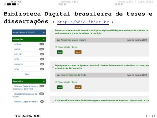 3. 3. Contexto Metodologia Resultados e Conclus�es Biblioteca Digital brasileira de teses e disserta��es < http://bdtd.ibict.br > (11a. ConfOA 2020) 3 / 13
