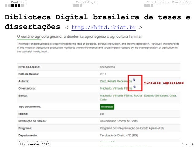 4. 4. Contexto Metodologia Resultados e Conclus�es Biblioteca Digital brasileira de teses e disserta��es < http://bdtd.ibict.br > V�nculos impl�citos (11a. ConfOA 2020) 4 / 13