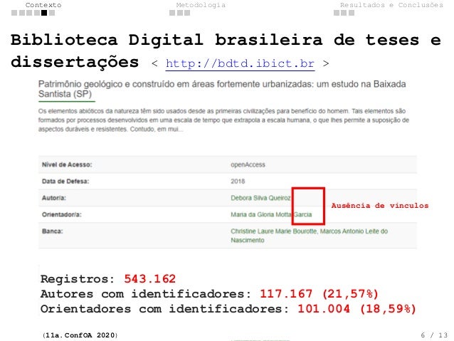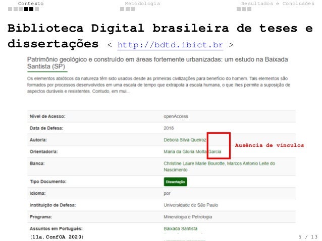 5. 5. Contexto Metodologia Resultados e Conclus�es Biblioteca Digital brasileira de teses e disserta��es < http://bdtd.ibict.br > Aus�ncia de v�nculos (11a. ConfOA 2020) 5 / 13