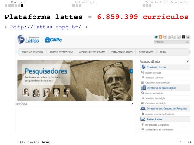 7. 7. Contexto Metodologia Resultados e Conclus�es Plataforma lattes - 6.859.399 curr�culos < http://lattes.cnpq.br/ > (11a. ConfOA 2020) 7 / 13