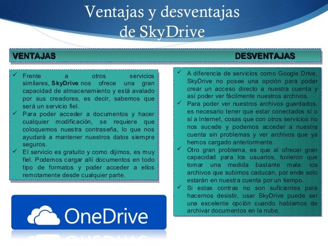 10. 10. Ventajas y desventajas de SkyDrive  Frente a otros servicios similares, SkyDrive nos ofrece una gran capacidad de almacenamiento y está avalado por sus creadores, es decir, sabemos que será un servicio fiel.  Para poder acceder a documentos y hacer cualquier modificación, se requiere que coloquemos nuestra contraseña, lo que nos ayudará a mantener nuestros datos siempre seguros.  El servicio es gratuito y como dijimos, es muy fiel. Podemos cargar allí documentos en todo tipo de formatos y poder acceder a ellos remotamente desde cualquier parte.  Frente a otros servicios similares, SkyDrive nos ofrece una gran capacidad de almacenamiento y está avalado por sus creadores, es decir, sabemos que será un servicio fiel.  Para poder acceder a documentos y hacer cualquier modificación, se requiere que coloquemos nuestra contraseña, lo que nos ayudará a mantener nuestros datos siempre seguros.  El servicio es gratuito y como dijimos, es muy fiel. Podemos cargar allí documentos en todo tipo de formatos y poder acceder a ellos remotamente desde cualquier parte. VENTAJASVENTAJAS DESVENTAJASDESVENTAJASVENTAJASVENTAJAS DESVENTAJASDESVENTAJAS  A diferencia de servicios como Google Drive, SkyDrive no posee una opción para poder crear un acceso directo a nuestra cuenta y así poder ver fácilmente nuestros archivos.  Para poder ver nuestros archivos guardados, es necesario tener que estar conectados sí o sí a Internet, cosas que con otros servicios no nos sucede y podemos acceder a nuestra cuenta sin problemas y ver archivos que ya hemos cargado anteriormente.  Otro gran problema, es que al ofrecer gran capacidad para los usuarios, tuvieron que tomar una medida bastante mala: los archivos que subimos caducan, por ende solo estarán en nuestra cuenta por un tiempo.  Si estas contras no son suficientes para hacernos desistir, usar SkyDrive puede ser una excelente opción cuando hablamos de archivar documentos en la nube.  A diferencia de servicios como Google Drive, SkyDrive no posee una opción para poder crear un acceso directo a nuestra cuenta y así poder ver fácilmente nuestros archivos.  Para poder ver nuestros archivos guardados, es necesario tener que estar conectados sí o sí a Internet, cosas que con otros servicios no nos sucede y podemos acceder a nuestra cuenta sin problemas y ver archivos que ya hemos cargado anteriormente.  Otro gran problema, es que al ofrecer gran capacidad para los usuarios, tuvieron que tomar una medida bastante mala: los archivos que subimos caducan, por ende solo estarán en nuestra cuenta por un tiempo.  Si estas contras no son suficientes para hacernos desistir, usar SkyDrive puede ser una excelente opción cuando hablamos de archivar documentos en la nube.