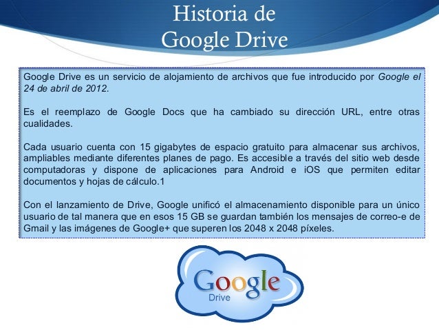 11. 11. Historia de Google Drive Google Drive es un servicio de alojamiento de archivos que fue introducido por Google el 24 de abril de 2012. Es el reemplazo de Google Docs que ha cambiado su dirección URL, entre otras cualidades. Cada usuario cuenta con 15 gigabytes de espacio gratuito para almacenar sus archivos, ampliables mediante diferentes planes de pago. Es accesible a través del sitio web desde computadoras y dispone de aplicaciones para Android e iOS que permiten editar documentos y hojas de cálculo.1 Con el lanzamiento de Drive, Google unificó el almacenamiento disponible para un único usuario de tal manera que en esos 15 GB se guardan también los mensajes de correo-e de Gmail y las imágenes de Google+ que superen los 2048 x 2048 píxeles.