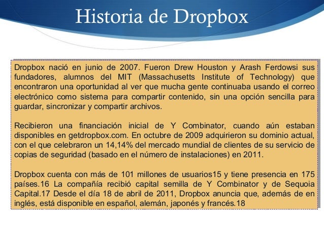 14. 14. Historia de Dropbox Dropbox nació en junio de 2007. Fueron Drew Houston y Arash Ferdowsi sus fundadores, alumnos del MIT (Massachusetts Institute of Technology) que encontraron una oportunidad al ver que mucha gente continuaba usando el correo electrónico como sistema para compartir contenido, sin una opción sencilla para guardar, sincronizar y compartir archivos. Recibieron una financiación inicial de Y Combinator, cuando aún estaban disponibles en getdropbox.com. En octubre de 2009 adquirieron su dominio actual, con el que celebraron un 14,14% del mercado mundial de clientes de su servicio de copias de seguridad (basado en el número de instalaciones) en 2011. Dropbox cuenta con más de 101 millones de usuarios15 y tiene presencia en 175 países.16 La compañía recibió capital semilla de Y Combinator y de Sequoia Capital.17 Desde el día 18 de abril de 2011, Dropbox anuncia que, además de en inglés, está disponible en español, alemán, japonés y francés.18 Dropbox nació en junio de 2007. Fueron Drew Houston y Arash Ferdowsi sus fundadores, alumnos del MIT (Massachusetts Institute of Technology) que encontraron una oportunidad al ver que mucha gente continuaba usando el correo electrónico como sistema para compartir contenido, sin una opción sencilla para guardar, sincronizar y compartir archivos. Recibieron una financiación inicial de Y Combinator, cuando aún estaban disponibles en getdropbox.com. En octubre de 2009 adquirieron su dominio actual, con el que celebraron un 14,14% del mercado mundial de clientes de su servicio de copias de seguridad (basado en el número de instalaciones) en 2011. Dropbox cuenta con más de 101 millones de usuarios15 y tiene presencia en 175 países.16 La compañía recibió capital semilla de Y Combinator y de Sequoia Capital.17 Desde el día 18 de abril de 2011, Dropbox anuncia que, además de en inglés, está disponible en español, alemán, japonés y francés.18