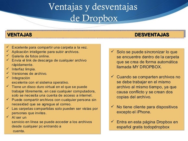 16. 16. Ventajas y desventajas de Dropbox  Excelente para compartir una carpeta a la vez.  Aplicación inteligente para subir archivos.  Galería de fotos online.  Envía el link de descarga de cualquier archivo rápidamente.  Interfaz limpia.  Versiones de archivo.  Integración excelente con el sistema operativo.  Tiene un disco duro virtual en el que se puede trabajar libremente, en casi cualquier computadora, solo se necesita una cuenta de acceso a internet.  Puede compartir archivos con cualquier persona sin necesidad que se agregue al correo.  Las carpetas compartidas solo pueden ser vistas por personas que invites.  Al ser un servicio en línea se puede acceder a los archivos desde cualquier pc entrando a cuenta.  Excelente para compartir una carpeta a la vez.  Aplicación inteligente para subir archivos.  Galería de fotos online.  Envía el link de descarga de cualquier archivo rápidamente.  Interfaz limpia.  Versiones de archivo.  Integración excelente con el sistema operativo.  Tiene un disco duro virtual en el que se puede trabajar libremente, en casi cualquier computadora, solo se necesita una cuenta de acceso a internet.  Puede compartir archivos con cualquier persona sin necesidad que se agregue al correo.  Las carpetas compartidas solo pueden ser vistas por personas que invites.  Al ser un servicio en línea se puede acceder a los archivos desde cualquier pc entrando a cuenta. VENTAJASVENTAJAS DESVENTAJASDESVENTAJASVENTAJASVENTAJAS DESVENTAJASDESVENTAJAS  Solo se puede sincronizar lo que se encuentre dentro de la carpeta que se crea de forma automática llamada MY DROPBOX.  Cuando se comparten archivos no se debe trabajar en el mismo archivo al mismo tiempo, ya que causa conflicto y se crean dos copias del archivo.  No tiene cliente para dispositivos excepto el iPhone.  Entra en esta página Dropbox en español gratis todopdropbox  Solo se puede sincronizar lo que se encuentre dentro de la carpeta que se crea de forma automática llamada MY DROPBOX.  Cuando se comparten archivos no se debe trabajar en el mismo archivo al mismo tiempo, ya que causa conflicto y se crean dos copias del archivo.  No tiene cliente para dispositivos excepto el iPhone.  Entra en esta página Dropbox en español gratis todopdropbox