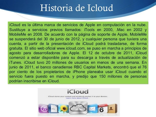 17. 17. Historia de Icloud iCloud es la última marca de servicios de Apple en computación en la nube. Sustituye a servicios previos llamados: iTools en 2000, .Mac en 2002 y MobileMe en 2008. De acuerdo con la página de soporte de Apple, MobileMe se suspenderá del 30 de junio de 2012, y cualquier persona que tuviera una cuenta, a partir de la presentación de iCloud podrá trasladarse, de forma gratuita. El sitio web oficial www.icloud.com, se puso en marcha a principios de agosto para desarrolladores de Apple. El 12 de octubre de 2011, iCloud comenzó a estar disponible para su descarga a través de actualización de iTunes. iCloud tuvo 20 millones de usuarios en menos de una semana. En junio de 2011, el banco canadiense RBC Capital Markets, encontró que el 76 por ciento de los propietarios de iPhone planeaba usar iCloud cuando el servicio fuera puesto en marcha, y predijo que 150 millones de personas podrían inscribirse en iCloud. iCloud es la última marca de servicios de Apple en computación en la nube. Sustituye a servicios previos llamados: iTools en 2000, .Mac en 2002 y MobileMe en 2008. De acuerdo con la página de soporte de Apple, MobileMe se suspenderá del 30 de junio de 2012, y cualquier persona que tuviera una cuenta, a partir de la presentación de iCloud podrá trasladarse, de forma gratuita. El sitio web oficial www.icloud.com, se puso en marcha a principios de agosto para desarrolladores de Apple. El 12 de octubre de 2011, iCloud comenzó a estar disponible para su descarga a través de actualización de iTunes. iCloud tuvo 20 millones de usuarios en menos de una semana. En junio de 2011, el banco canadiense RBC Capital Markets, encontró que el 76 por ciento de los propietarios de iPhone planeaba usar iCloud cuando el servicio fuera puesto en marcha, y predijo que 150 millones de personas podrían inscribirse en iCloud.