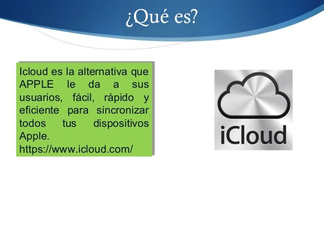 18. 18. ¿Qué es? Icloud es la alternativa que APPLE le da a sus usuarios, fácil, rápido y eficiente para sincronizar todos tus dispositivos Apple. https://www.icloud.com/ Icloud es la alternativa que APPLE le da a sus usuarios, fácil, rápido y eficiente para sincronizar todos tus dispositivos Apple. https://www.icloud.com/