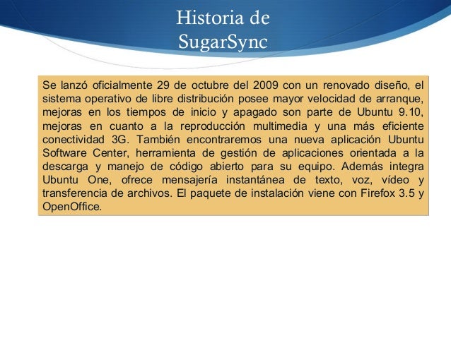 23. 23. Historia de SugarSync Se lanzó oficialmente 29 de octubre del 2009 con un renovado diseño, el sistema operativo de libre distribución posee mayor velocidad de arranque, mejoras en los tiempos de inicio y apagado son parte de Ubuntu 9.10, mejoras en cuanto a la reproducción multimedia y una más eficiente conectividad 3G. También encontraremos una nueva aplicación Ubuntu Software Center, herramienta de gestión de aplicaciones orientada a la descarga y manejo de código abierto para su equipo. Además integra Ubuntu One, ofrece mensajería instantánea de texto, voz, vídeo y transferencia de archivos. El paquete de instalación viene con Firefox 3.5 y OpenOffice. Se lanzó oficialmente 29 de octubre del 2009 con un renovado diseño, el sistema operativo de libre distribución posee mayor velocidad de arranque, mejoras en los tiempos de inicio y apagado son parte de Ubuntu 9.10, mejoras en cuanto a la reproducción multimedia y una más eficiente conectividad 3G. También encontraremos una nueva aplicación Ubuntu Software Center, herramienta de gestión de aplicaciones orientada a la descarga y manejo de código abierto para su equipo. Además integra Ubuntu One, ofrece mensajería instantánea de texto, voz, vídeo y transferencia de archivos. El paquete de instalación viene con Firefox 3.5 y OpenOffice.