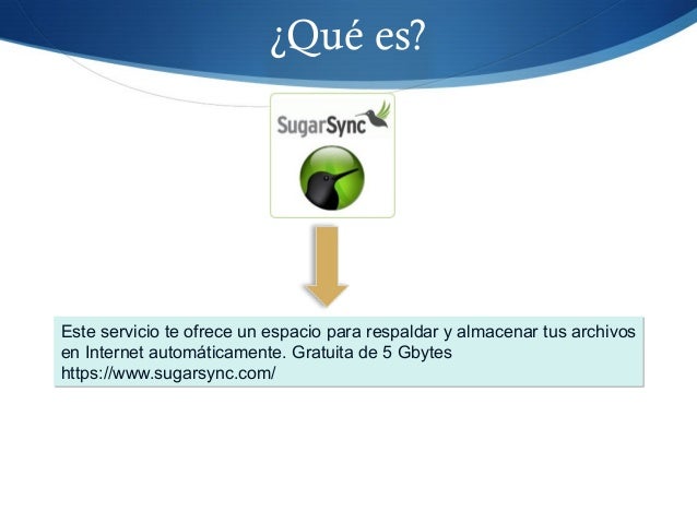 24. 24. ¿Qué es? Este servicio te ofrece un espacio para respaldar y almacenar tus archivos en Internet automáticamente. Gratuita de 5 Gbytes https://www.sugarsync.com/ Este servicio te ofrece un espacio para respaldar y almacenar tus archivos en Internet automáticamente. Gratuita de 5 Gbytes https://www.sugarsync.com/