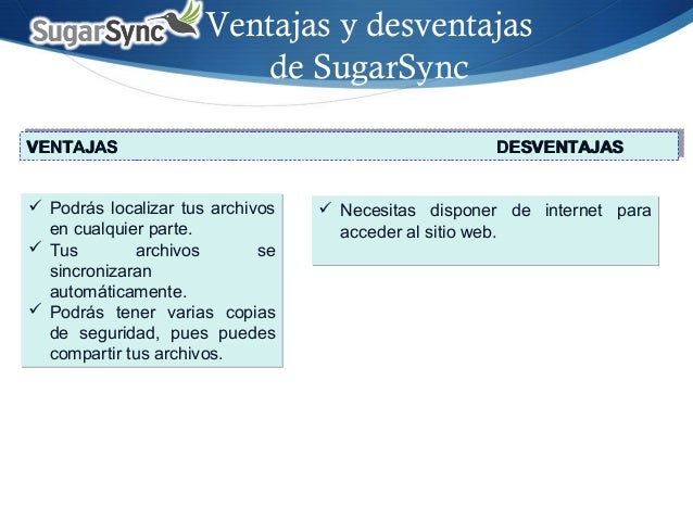25. 25. Ventajas y desventajas de SugarSync  Necesitas disponer de internet para acceder al sitio web.  Necesitas disponer de internet para acceder al sitio web.  Podrás localizar tus archivos en cualquier parte.  Tus archivos se sincronizaran automáticamente.  Podrás tener varias copias de seguridad, pues puedes compartir tus archivos.  Podrás localizar tus archivos en cualquier parte.  Tus archivos se sincronizaran automáticamente.  Podrás tener varias copias de seguridad, pues puedes compartir tus archivos. VENTAJASVENTAJAS DESVENTAJASDESVENTAJASVENTAJASVENTAJAS DESVENTAJASDESVENTAJAS