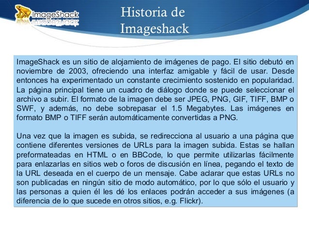26. 26. Historia de Imageshack ImageShack es un sitio de alojamiento de imágenes de pago. El sitio debutó en noviembre de 2003, ofreciendo una interfaz amigable y fácil de usar. Desde entonces ha experimentado un constante crecimiento sostenido en popularidad. La página principal tiene un cuadro de diálogo donde se puede seleccionar el archivo a subir. El formato de la imagen debe ser JPEG, PNG, GIF, TIFF, BMP o SWF, y además, no debe sobrepasar el 1.5 Megabytes. Las imágenes en formato BMP o TIFF serán automáticamente convertidas a PNG. Una vez que la imagen es subida, se redirecciona al usuario a una página que contiene diferentes versiones de URLs para la imagen subida. Estas se hallan preformateadas en HTML o en BBCode, lo que permite utilizarlas fácilmente para enlazarlas en sitios web o foros de discusión en línea, pegando el texto de la URL deseada en el cuerpo de un mensaje. Cabe aclarar que estas URLs no son publicadas en ningún sitio de modo automático, por lo que sólo el usuario y las personas a quien él les dé los enlaces podrán acceder a sus imágenes (a diferencia de lo que sucede en otros sitios, e.g. Flickr). ImageShack es un sitio de alojamiento de imágenes de pago. El sitio debutó en noviembre de 2003, ofreciendo una interfaz amigable y fácil de usar. Desde entonces ha experimentado un constante crecimiento sostenido en popularidad. La página principal tiene un cuadro de diálogo donde se puede seleccionar el archivo a subir. El formato de la imagen debe ser JPEG, PNG, GIF, TIFF, BMP o SWF, y además, no debe sobrepasar el 1.5 Megabytes. Las imágenes en formato BMP o TIFF serán automáticamente convertidas a PNG. Una vez que la imagen es subida, se redirecciona al usuario a una página que contiene diferentes versiones de URLs para la imagen subida. Estas se hallan preformateadas en HTML o en BBCode, lo que permite utilizarlas fácilmente para enlazarlas en sitios web o foros de discusión en línea, pegando el texto de la URL deseada en el cuerpo de un mensaje. Cabe aclarar que estas URLs no son publicadas en ningún sitio de modo automático, por lo que sólo el usuario y las personas a quien él les dé los enlaces podrán acceder a sus imágenes (a diferencia de lo que sucede en otros sitios, e.g. Flickr).