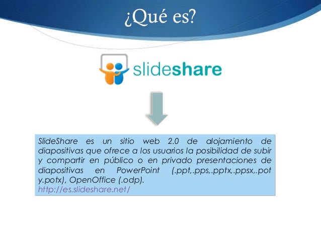 29. 29. ¿Qué es? SlideShare es un sitio web 2.0 de alojamiento de diapositivas que ofrece a los usuarios la posibilidad de subir y compartir en público o en privado presentaciones de diapositivas en PowerPoint (.ppt,.pps,.pptx,.ppsx,.pot y.potx), OpenOffice (.odp). http://es.slideshare.net/ SlideShare es un sitio web 2.0 de alojamiento de diapositivas que ofrece a los usuarios la posibilidad de subir y compartir en público o en privado presentaciones de diapositivas en PowerPoint (.ppt,.pps,.pptx,.ppsx,.pot y.potx), OpenOffice (.odp). http://es.slideshare.net/