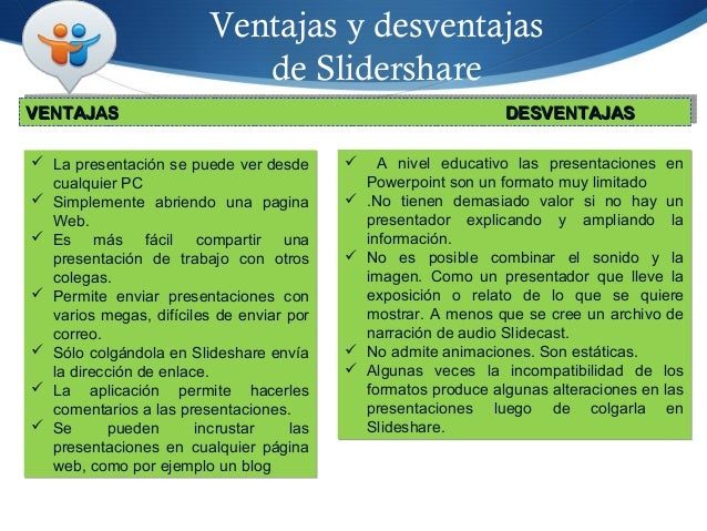 30. 30. Ventajas y desventajas de Slidershare  La presentación se puede ver desde cualquier PC  Simplemente abriendo una pagina Web.  Es más fácil compartir una presentación de trabajo con otros colegas.  Permite enviar presentaciones con varios megas, difíciles de enviar por correo.  Sólo colgándola en Slideshare envía la dirección de enlace.  La aplicación permite hacerles comentarios a las presentaciones.  Se pueden incrustar las presentaciones en cualquier página web, como por ejemplo un blog  La presentación se puede ver desde cualquier PC  Simplemente abriendo una pagina Web.  Es más fácil compartir una presentación de trabajo con otros colegas.  Permite enviar presentaciones con varios megas, difíciles de enviar por correo.  Sólo colgándola en Slideshare envía la dirección de enlace.  La aplicación permite hacerles comentarios a las presentaciones.  Se pueden incrustar las presentaciones en cualquier página web, como por ejemplo un blog  A nivel educativo las presentaciones en Powerpoint son un formato muy limitado  .No tienen demasiado valor si no hay un presentador explicando y ampliando la información.  No es posible combinar el sonido y la imagen. Como un presentador que lleve la exposición o relato de lo que se quiere mostrar. A menos que se cree un archivo de narración de audio Slidecast.  No admite animaciones. Son estáticas.  Algunas veces la incompatibilidad de los formatos produce algunas alteraciones en las presentaciones luego de colgarla en Slideshare.  A nivel educativo las presentaciones en Powerpoint son un formato muy limitado  .No tienen demasiado valor si no hay un presentador explicando y ampliando la información.  No es posible combinar el sonido y la imagen. Como un presentador que lleve la exposición o relato de lo que se quiere mostrar. A menos que se cree un archivo de narración de audio Slidecast.  No admite animaciones. Son estáticas.  Algunas veces la incompatibilidad de los formatos produce algunas alteraciones en las presentaciones luego de colgarla en Slideshare. VENTAJASVENTAJAS DESVENTAJASDESVENTAJASVENTAJASVENTAJAS DESVENTAJASDESVENTAJAS