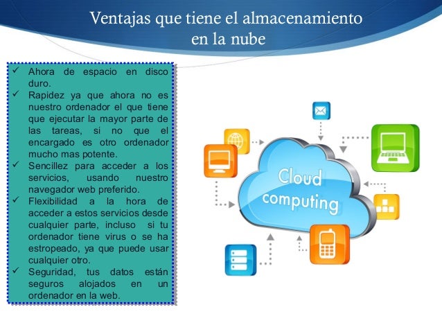 4. 4. Ventajas que tiene el almacenamiento en la nube  Ahora de espacio en disco duro.  Rapidez ya que ahora no es nuestro ordenador el que tiene que ejecutar la mayor parte de las tareas, si no que el encargado es otro ordenador mucho mas potente.  Sencillez para acceder a los servicios, usando nuestro navegador web preferido.  Flexibilidad a la hora de acceder a estos servicios desde cualquier parte, incluso si tu ordenador tiene virus o se ha estropeado, ya que puede usar cualquier otro.  Seguridad, tus datos están seguros alojados en un ordenador en la web.  Ahora de espacio en disco duro.  Rapidez ya que ahora no es nuestro ordenador el que tiene que ejecutar la mayor parte de las tareas, si no que el encargado es otro ordenador mucho mas potente.  Sencillez para acceder a los servicios, usando nuestro navegador web preferido.  Flexibilidad a la hora de acceder a estos servicios desde cualquier parte, incluso si tu ordenador tiene virus o se ha estropeado, ya que puede usar cualquier otro.  Seguridad, tus datos están seguros alojados en un ordenador en la web.