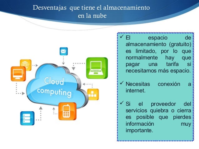 5. 5. Desventajas que tiene el almacenamiento en la nube  El espacio de almacenamiento (gratuito) es limitado, por lo que normalmente hay que pagar una tarifa si necesitamos más espacio.  Necesitas conexión a internet.  Si el proveedor del servicios quiebra o cierra es posible que pierdes información muy importante.  El espacio de almacenamiento (gratuito) es limitado, por lo que normalmente hay que pagar una tarifa si necesitamos más espacio.  Necesitas conexión a internet.  Si el proveedor del servicios quiebra o cierra es posible que pierdes información muy importante.