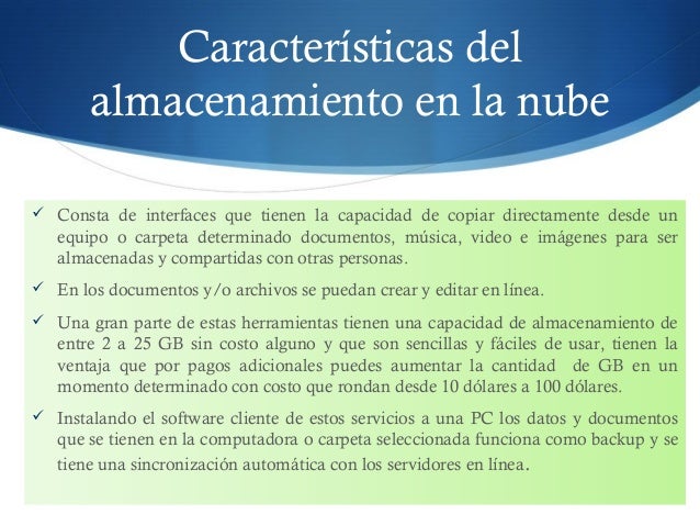 6. 6. Características del almacenamiento en la nube  Consta de interfaces que tienen la capacidad de copiar directamente desde un equipo o carpeta determinado documentos, música, video e imágenes para ser almacenadas y compartidas con otras personas.  En los documentos y/o archivos se puedan crear y editar en línea.  Una gran parte de estas herramientas tienen una capacidad de almacenamiento de entre 2 a 25 GB sin costo alguno y que son sencillas y fáciles de usar, tienen la ventaja que por pagos adicionales puedes aumentar la cantidad de GB en un momento determinado con costo que rondan desde 10 dólares a 100 dólares.  Instalando el software cliente de estos servicios a una PC los datos y documentos que se tienen en la computadora o carpeta seleccionada funciona como backup y se tiene una sincronización automática con los servidores en línea.