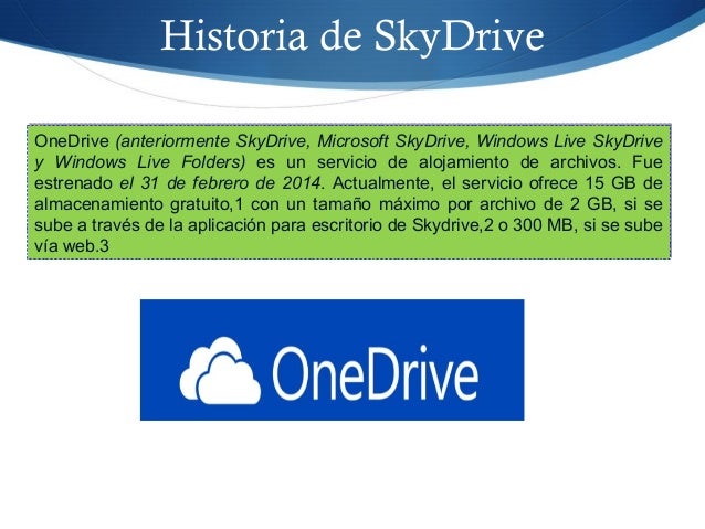 8. 8. Historia de SkyDrive OneDrive (anteriormente SkyDrive, Microsoft SkyDrive, Windows Live SkyDrive y Windows Live Folders) es un servicio de alojamiento de archivos. Fue estrenado el 31 de febrero de 2014. Actualmente, el servicio ofrece 15 GB de almacenamiento gratuito,1 con un tamaño máximo por archivo de 2 GB, si se sube a través de la aplicación para escritorio de Skydrive,2 o 300 MB, si se sube vía web.3 OneDrive (anteriormente SkyDrive, Microsoft SkyDrive, Windows Live SkyDrive y Windows Live Folders) es un servicio de alojamiento de archivos. Fue estrenado el 31 de febrero de 2014. Actualmente, el servicio ofrece 15 GB de almacenamiento gratuito,1 con un tamaño máximo por archivo de 2 GB, si se sube a través de la aplicación para escritorio de Skydrive,2 o 300 MB, si se sube vía web.3