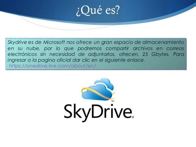 9. 9. Skydrive es de Microsoft nos ofrece un gran espacio de almacenamiento en su nube, por lo que podremos compartir archivos en correos electrónicos sin necesidad de adjuntarlos. ofrecen, 25 Gbytes. Para ingresar a la pagina oficial dar clic en el siguiente enlace. https://onedrive.live.com/about/en/ Skydrive es de Microsoft nos ofrece un gran espacio de almacenamiento en su nube, por lo que podremos compartir archivos en correos electrónicos sin necesidad de adjuntarlos. ofrecen, 25 Gbytes. Para ingresar a la pagina oficial dar clic en el siguiente enlace. https://onedrive.live.com/about/en/ ¿Qué es?