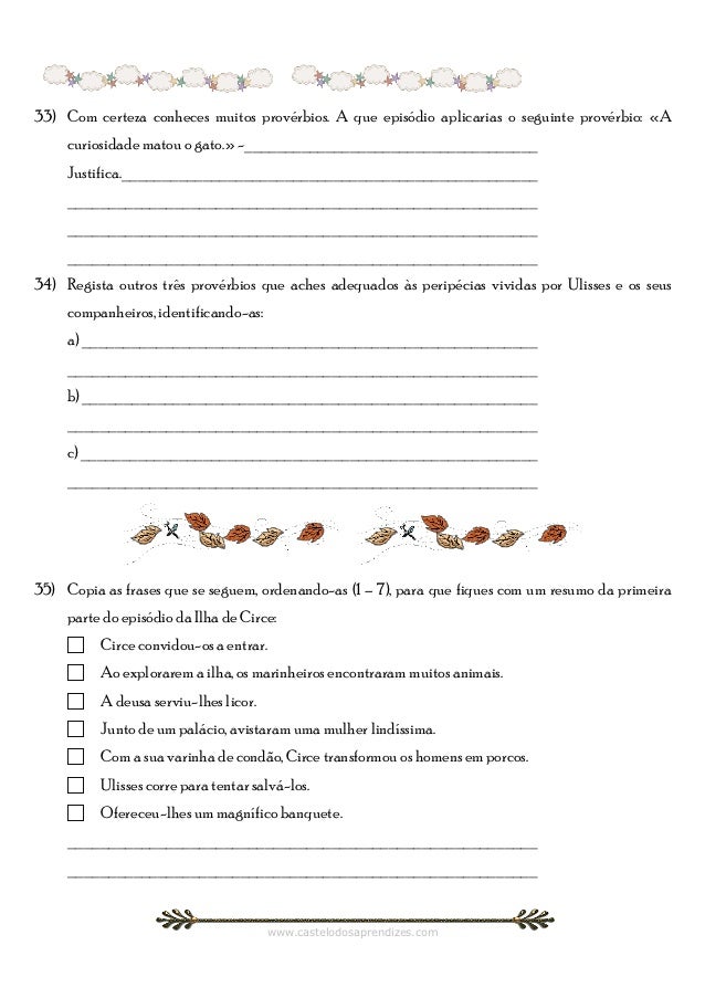 10. 10. 33) Com certeza conheces muitos provérbios. A que episódio aplicarias o seguinte provérbio: «A curiosidade matou o gato.» -____________________________________ Justifica.___________________________________________________ _________________________________________________________ _________________________________________________________ _________________________________________________________34) Regista outros três provérbios que aches adequados às peripécias vividas por Ulisses e os seus companheiros, identificando-as: a) _______________________________________________________ _________________________________________________________ b) _______________________________________________________ _________________________________________________________ c) ________________________________________________________ _________________________________________________________35) Copia as frases que se seguem, ordenando-as (1 – 7), para que fiques com um resumo da primeira parte do episódio da Ilha de Circe:  Circe convidou-os a entrar.  Ao explorarem a ilha, os marinheiros encontraram muitos animais.  A deusa serviu-lhes licor.  Junto de um palácio, avistaram uma mulher lindíssima.  Com a sua varinha de condão, Circe transformou os homens em porcos.  Ulisses corre para tentar salvá-los.  Ofereceu-lhes um magnífico banquete. _________________________________________________________ _________________________________________________________ www.castelodosaprendizes.com
