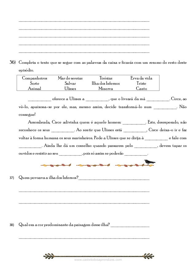 11. 11. _________________________________________________________ _________________________________________________________ _________________________________________________________ _________________________________________________________ _________________________________________________________36) Completa o texto que se segue com as palavras da caixa e ficarás com um resumo do resto deste episódio. Companheiros Mar de sereias Tirésias Erva da vida Sorte Salvar Ilha dos Infernos Triste Animal Ulisses Minerva Canto __________ oferece a Ulisses a __________, que o livrará da má __________. Circe, ao vê-lo, apaixona-se por ele, mas, mesmo assim, decide transformá-lo num __________. Não consegue! Assombrada, Circe adivinha quem é aquele homem: __________. Este, desesperado, não reconhece os seus __________. Ao sentir que Ulisses está __________, Circe deixa-o ir e faz voltar à forma humana os seus marinheiros. Pede a Ulisses que se dirija à __________ e fale com __________. Ainda lhe dá um conselho: quando passarem pelo __________, devem tapar os ouvidos e resistir ao seu __________, pois só assim se poderão __________.37) Quem povoava a ilha dos Infernos?_______________________________ _________________________________________________________ _________________________________________________________38) Qual era a cor predominante da paisagem desse ilha? _________________ _________________________________________________________ www.castelodosaprendizes.com