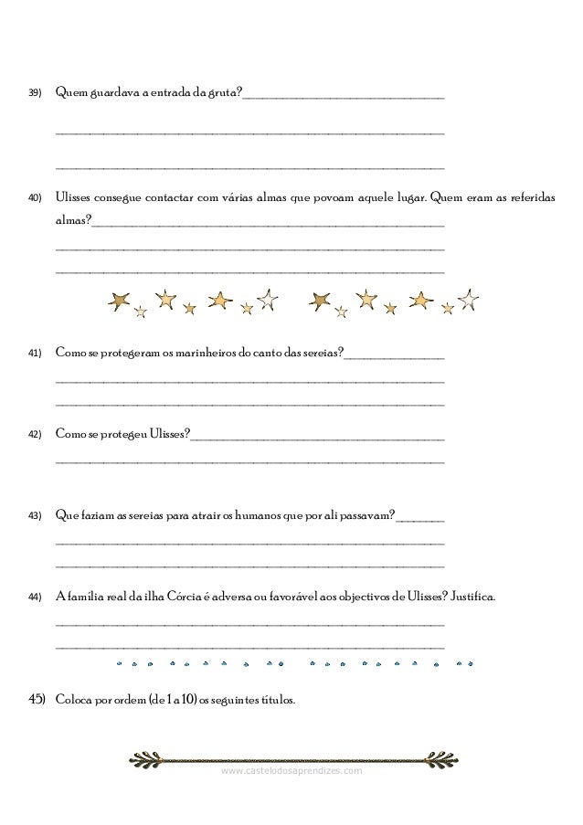 12. 12. 39) Quem guardava a entrada da gruta?______________________________ _________________________________________________________ _________________________________________________________40) Ulisses consegue contactar com várias almas que povoam aquele lugar. Quem eram as referidas almas?____________________________________________________ _________________________________________________________ _________________________________________________________41) Como se protegeram os marinheiros do canto das sereias?_______________ _________________________________________________________ _________________________________________________________42) Como se protegeu Ulisses?______________________________________ _________________________________________________________43) Que faziam as sereias para atrair os humanos que por ali passavam?________ _________________________________________________________ _________________________________________________________44) A família real da ilha Córcia é adversa ou favorável aos objectivos de Ulisses? Justifica. _________________________________________________________ _________________________________________________________45) Coloca por ordem (de 1 a 10) os seguintes títulos. www.castelodosaprendizes.com