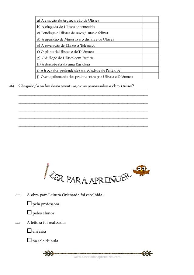 13. 13. a) A emoção de Argus, o cão de Ulisses b) A chegada de Ulisses adormecido c) Penélope e Ulisses de novo juntos e felizes d) A aparição de Minerva e o disfarce de Ulisses e) A revelação de Ulisses a Telémaco f) O plano de Ulisses e de Telémaco g) O diálogo de Ulisses com Eumeu h) A descoberta da ama Euricleia i) A troça dos pretendentes e a bondade de Penélope j) O aniquilamento dos pretendentes por Ulisses e Telémaco46) Chegado/a ao fim desta aventura, o que pensas sobre a obra Ulisses?_______ _________________________________________________________ _________________________________________________________ _________________________________________________________ _________________________________________________________ _________________________________________________________  A obra para Leitura Orientada foi escolhida:  pela professora  pelos alunos  A leitura foi realizada:  em casa  na sala de aula www.castelodosaprendizes.com