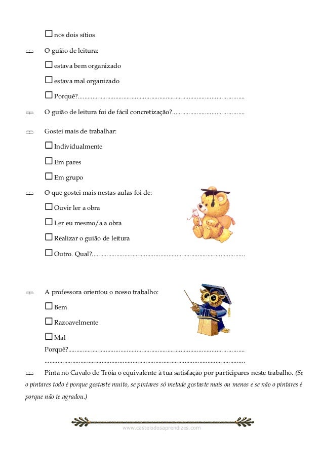 14. 14.  nos dois sítios O guião de leitura:  estava bem organizado  estava mal organizado  Porquê?...................................................................................................... O guião de leitura foi de fácil concretização?............................................ Gostei mais de trabalhar:  Individualmente  Em pares  Em grupo O que gostei mais nestas aulas foi de:  Ouvir ler a obra  Ler eu mesmo/a a obra  Realizar o guião de leitura  Outro. Qual?.............................................................................................. A professora orientou o nosso trabalho:  Bem  Razoavelmente  Mal Porquê?............................................................................................................ ........................................................................................................................... Pinta no Cavalo de Tróia o equivalente à tua satisfação por participares neste trabalho. (Seo pintares todo é porque gostaste muito, se pintares só metade gostaste mais ou menos e se não o pintares éporque não te agradou.) www.castelodosaprendizes.com