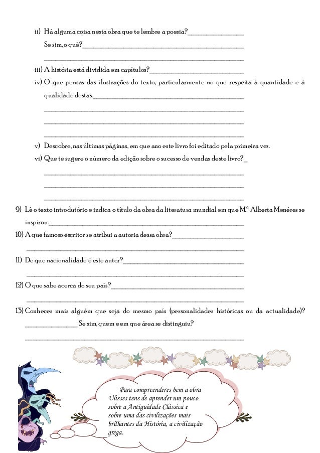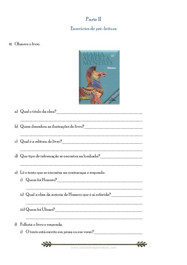 4. 4. Parte II Exercícios de pré-leitura8) Observe o livro. a) Qual o título da obra?________________________________________ ________________________________________________________ b) Quem desenhou as ilustrações do livro?___________________________ ________________________________________________________ c) Qual é a editora do livro?_____________________________________ ________________________________________________________ d) Que tipo de informação se encontra na lombada?____________________ ________________________________________________________ e) Lê o texto que se encontra na contracapa e responde. i) Quem foi Homero?_______________________________________ ______________________________________________________ ii) Qual a obra da autoria de Homero que é aí referida?_______________ ______________________________________________________ iii) Quem foi Ulisses?________________________________________ ______________________________________________________ f) Folheia o livro e responda. i) O texto está escrito em prosa ou em verso?_______________________ www.castelodosaprendizes.com
