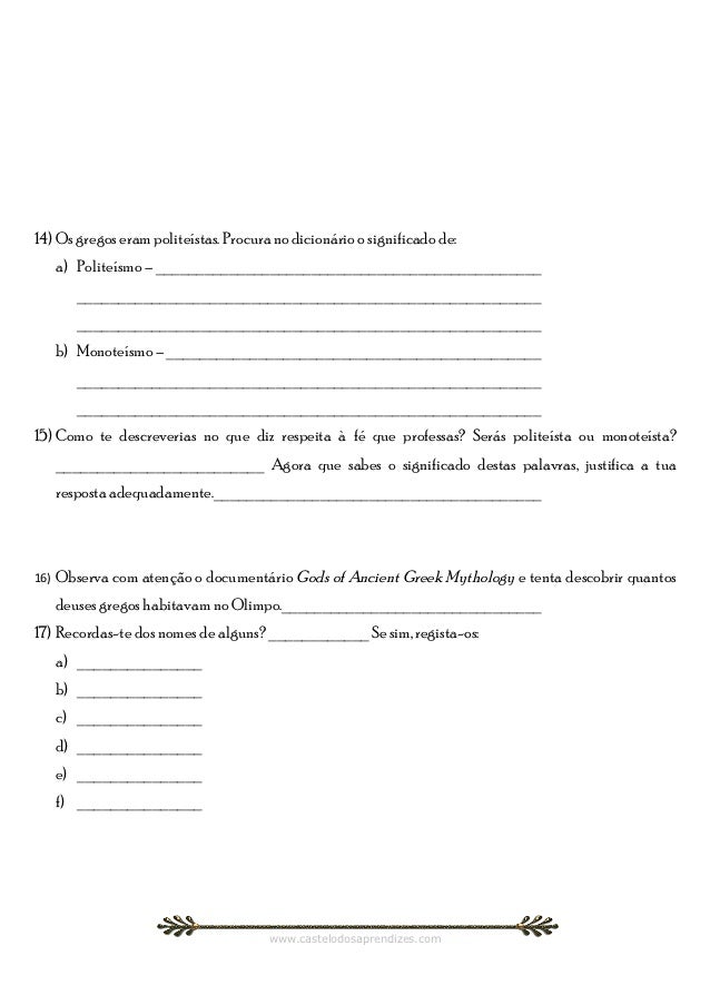 6. 6. 14) Os gregos eram politeístas. Procura no dicionário o significado de: a) Politeísmo – _______________________________________________ ________________________________________________________ ________________________________________________________ b) Monoteísmo – _____________________________________________ ________________________________________________________ ________________________________________________________15) Como te descreverias no que diz respeita à fé que professas? Serás politeísta ou monoteísta? _________________________ Agora que sabes o significado destas palavras, justifica a tua resposta adequadamente.________________________________________16) Observa com atenção o documentário Gods of Ancient Greek Mythology e tenta descobrir quantos deuses gregos habitavam no Olimpo.________________________________17) Recordas-te dos nomes de alguns? ____________ Se sim, regista-os: a) _______________ b) _______________ c) _______________ d) _______________ e) _______________ f) _______________ www.castelodosaprendizes.com