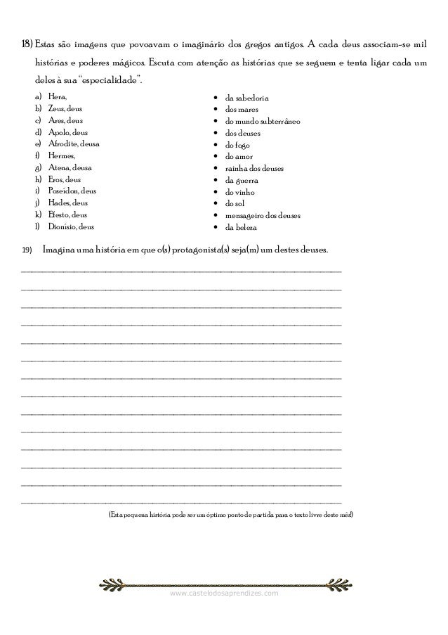 7. 7. 18) Estas são imagens que povoavam o imaginário dos gregos antigos. A cada deus associam-se mil histórias e poderes mágicos. Escuta com atenção as histórias que se seguem e tenta ligar cada um deles à sua “especialidade”. a) Hera, • da sabedoria b) Zeus, deus • dos mares c) Ares, deus • do mundo subterrâneo d) Apolo, deus • dos deuses e) Afrodite, deusa • do fogo f) Hermes, • do amor g) Atena, deusa • rainha dos deuses h) Eros, deus • da guerra i) Poseídon, deus • do vinho j) Hades, deus • do sol k) Efesto, deus • mensageiro dos deuses l) Dionísio, deus • da beleza19) Imagina uma história em que o(s) protagonista(s) seja(m) um destes deuses.______________________________________________________________________________________________________________________________________________________________________________________________________________________________________________________________________________________________________________________________________________________________________________________________________________________________________________________________________________________________________________________________________________________________________________________________________________________________________________________________________________________________________________________________________________________________________________________________________________________________________________________________________________________ (Esta pequena história pode ser um óptimo ponto de partida para o texto livre deste mês!) www.castelodosaprendizes.com