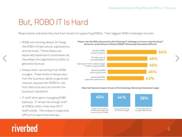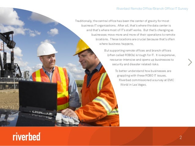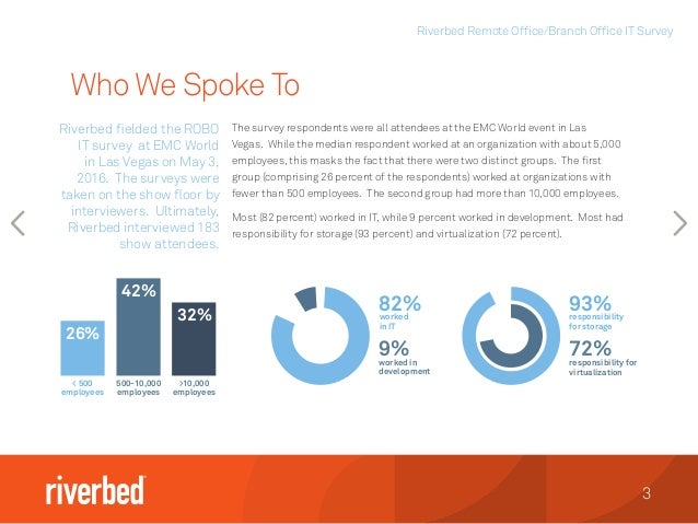 Riverbed conducted a remote office/branch office IT survey at EMC World on May 3, 2016. The surveys were taken on the show floor and 183 people took part. The number of employees at their locations range from less than 500 to over 10,000. http://rvbd.ly/1YvjwTI