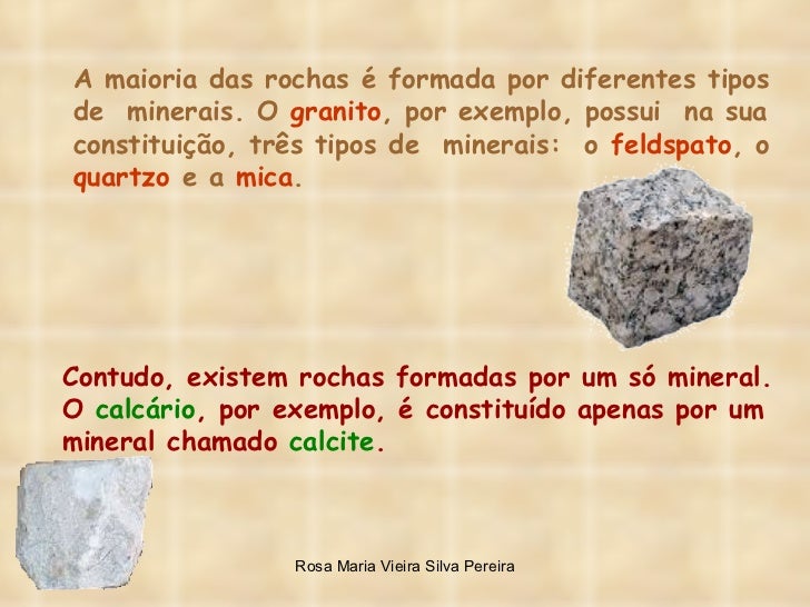 12. 12. A maioria das rochas é formada por diferentes tipos de minerais. O granito , por exemplo, possui na sua constituição, três tipos de minerais: o feldspato , o quartzo e a mica . Contudo, existem rochas formadas por um só mineral. O calcário , por exemplo, é constituído apenas por um mineral chamado calcite .