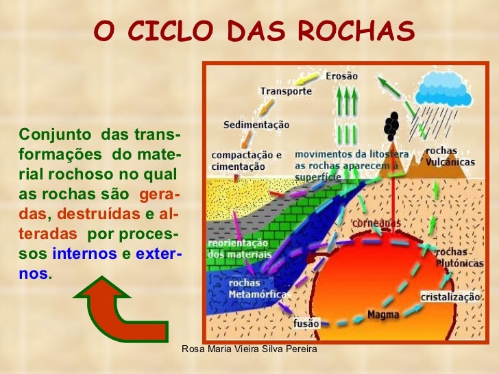 15. 15. O CICLO DAS ROCHAS Conjunto das trans- formações do mate- rial rochoso no qual as rochas são gera- das , destruídas e al- teradas por proces- sos internos e exter- nos .