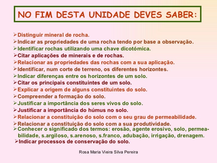 2. 2. NO FIM DESTA UNIDADE DEVES SABER: <ul><li>Distinguir mineral de rocha. </li></ul><ul><li>Indicar as propriedades de uma rocha tendo por base a observação. </li></ul><ul><li>Identificar rochas utilizando uma chave dicotómica. </li></ul><ul><li>Citar aplicações de minerais e de rochas. </li></ul><ul><li>Relacionar as propriedades das rochas com a sua aplicação. </li></ul><ul><li>Identificar, num corte de terreno, os diferentes horizontes. </li></ul><ul><li>Indicar diferenças entre os horizontes de um solo. </li></ul><ul><li>Citar os principais constituintes de um solo. </li></ul><ul><li>Explicar a origem de alguns constituintes do solo. </li></ul><ul><li>Compreender a formação do solo. </li></ul><ul><li>Justificar a importância dos seres vivos do solo. </li></ul><ul><li>Justificar a importância do húmus no solo. </li></ul><ul><li>Relacionar a constituição do solo com o seu grau de permeabilidade. </li></ul><ul><li>Relacionar a constituição do solo com a sua produtividade. </li></ul><ul><li>Conhecer o significado dos termos: erosão, agente erosivo, solo, permea- </li></ul><ul><li>bilidade, s.argiloso, s.arenoso, s.franco, adubação, irrigação, drenagem. </li></ul><ul><li>Indicar processos de conservação do solo. </li></ul>