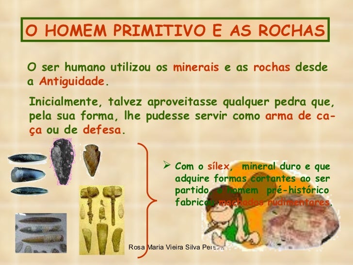 22. 22. O HOMEM PRIMITIVO E AS ROCHAS O ser humano utilizou os minerais e as rochas desde a Antiguidade . Inicialmente, talvez aproveitasse qualquer pedra que, pela sua forma, lhe pudesse servir como arma de ca- ça ou de defesa . <ul><li>Com o sílex , mineral duro e que </li></ul><ul><li>adquire formas cortantes ao ser </li></ul><ul><li>partido, o homem pré-histórico </li></ul><ul><li>fabricou machados rudimentares . </li></ul>