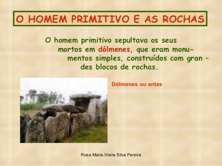 26. 26. O HOMEM PRIMITIVO E AS ROCHAS O homem primitivo sepultava os seus mortos em dólmenes , que eram monu- mentos simples, construídos com gran – des blocos de rochas. Dólmenes ou antas