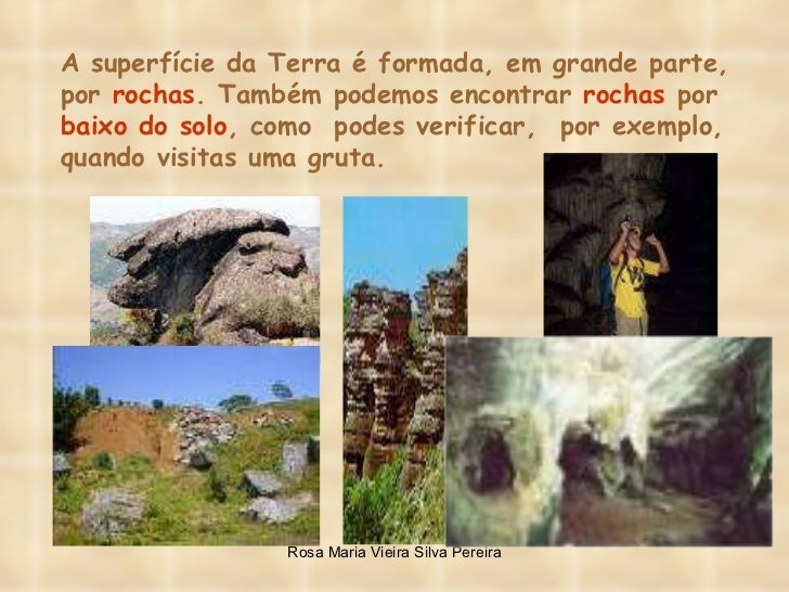 3. 3. A superfície da Terra é formada, em grande parte, por rochas . Também podemos encontrar rochas por baixo do solo , como podes verificar, por exemplo, quando visitas uma gruta.
