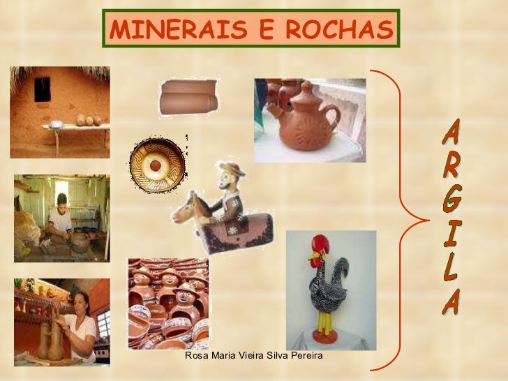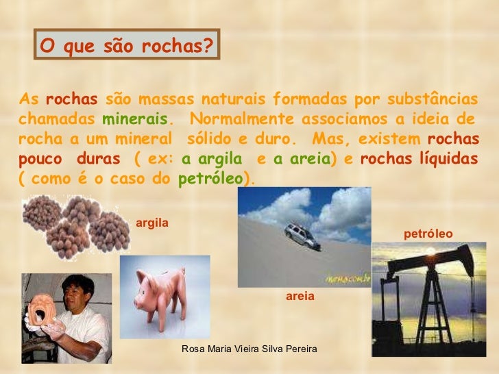6. 6. O que são rochas? As rochas são massas naturais formadas por substâncias chamadas minerais . Normalmente associamos a ideia de rocha a um mineral sólido e duro. Mas, existem rochas pouco duras ( ex: a argila e a areia ) e rochas líquidas ( como é o caso do petróleo ).   argila areia petróleo