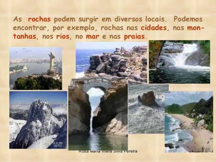 5. 5. As rochas podem surgir em diversos locais. Podemos encontrar, por exemplo, rochas nas cidades , nas mon- tanhas , nos rios , no mar e nas praias .