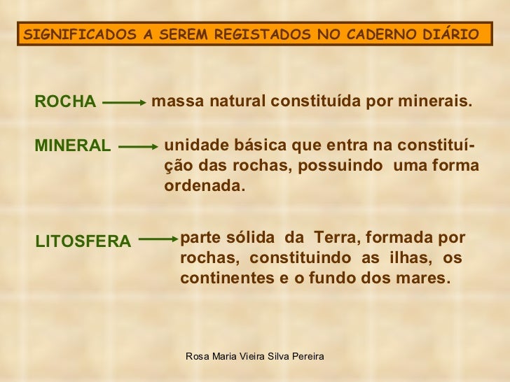 7. 7. SIGNIFICADOS A SEREM REGISTADOS NO CADERNO DIÁRIO ROCHA massa natural constituída por minerais. MINERAL unidade básica que entra na constituí- ção das rochas, possuindo uma forma ordenada. LITOSFERA parte sólida da Terra, formada por rochas, constituindo as ilhas, os continentes e o fundo dos mares.