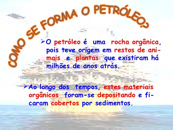 8. 8. COMO SE FORMA O PETRÓLEO? <ul><li>O petróleo é uma rocha orgânica , </li></ul><ul><li>pois teve origem em restos de ani- </li></ul><ul><li>mais e plantas que existiram há </li></ul><ul><li>milhões de anos atrás. </li></ul><ul><li>Ao longo dos tempos, estes materiais </li></ul><ul><li>orgânicos foram-se depositando e fi- </li></ul><ul><li>caram cobertos por sedimentos. </li></ul>