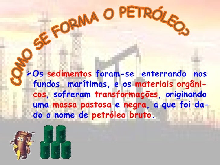 9. 9. COMO SE FORMA O PETRÓLEO? <ul><li>Os sedimentos foram-se enterrando nos </li></ul><ul><li>fundos marítimos, e os materiais orgâni- </li></ul><ul><li>cos , sofreram transformações , originando </li></ul><ul><li>uma massa pastosa e negra , a que foi da- </li></ul><ul><li>do o nome de petróleo bruto . </li></ul>